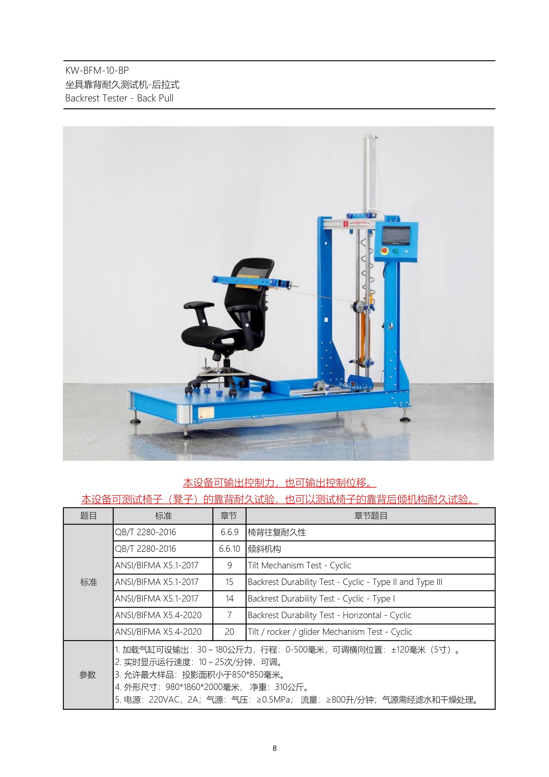1. 符合GB BIFMA標(biāo)準(zhǔn)的座具靠背耐久試驗(yàn)機(jī);